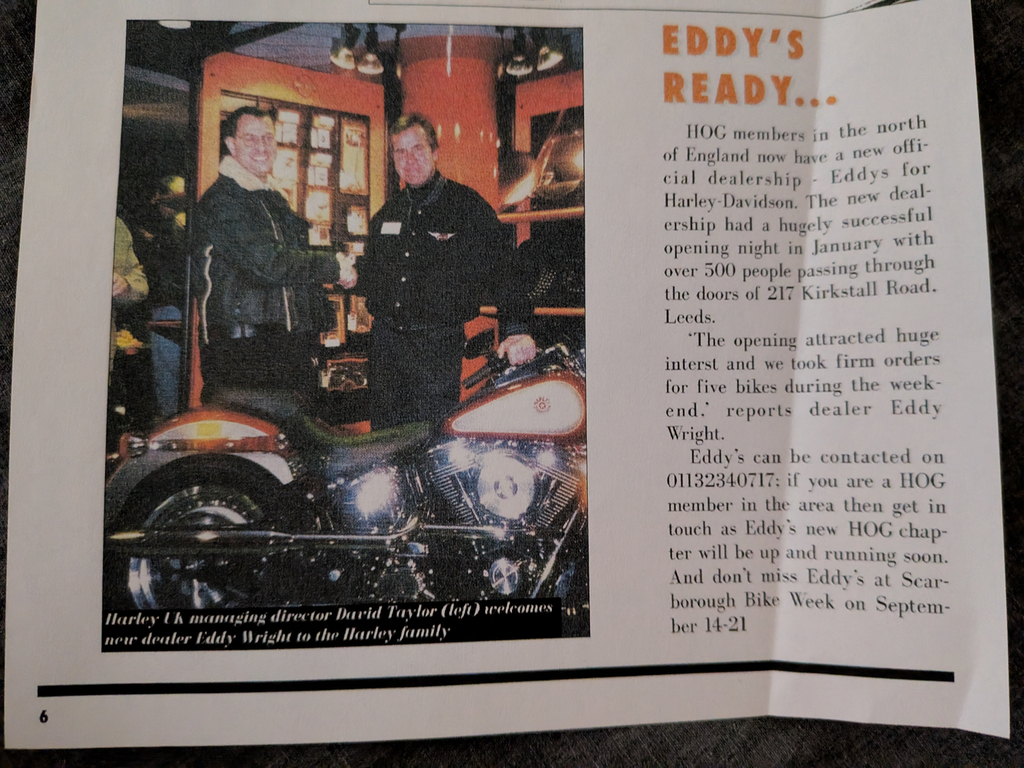On opening day it was reported that around 500 people attended. Eddy recalls that he sold 5 bikes with Billy Clubb (who later became editor of Screamin’ Views a forerunner to what we now call AV Torque) purchasing a FLSTC Heritage Softail. Within three years of opening Leeds was at the top of the UK sales charts; it sold over 300 bikes in 2006.